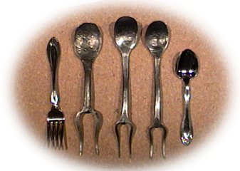 ![]() These are my first attempts at sporks, in order from left to right, with a regular fork and spoon for comparison. On my first attempt, I made everything too large. The last two, I made the ends the right size, but the handle is still too long. |